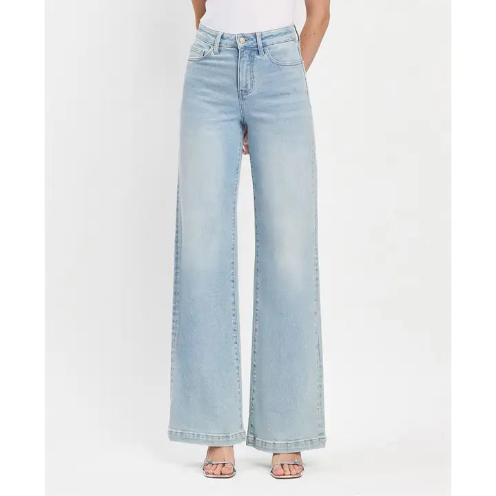 High rise full length wide leg jeans Comfort stretch denim, high rise waist, finished hem, full length, wide leg jeans